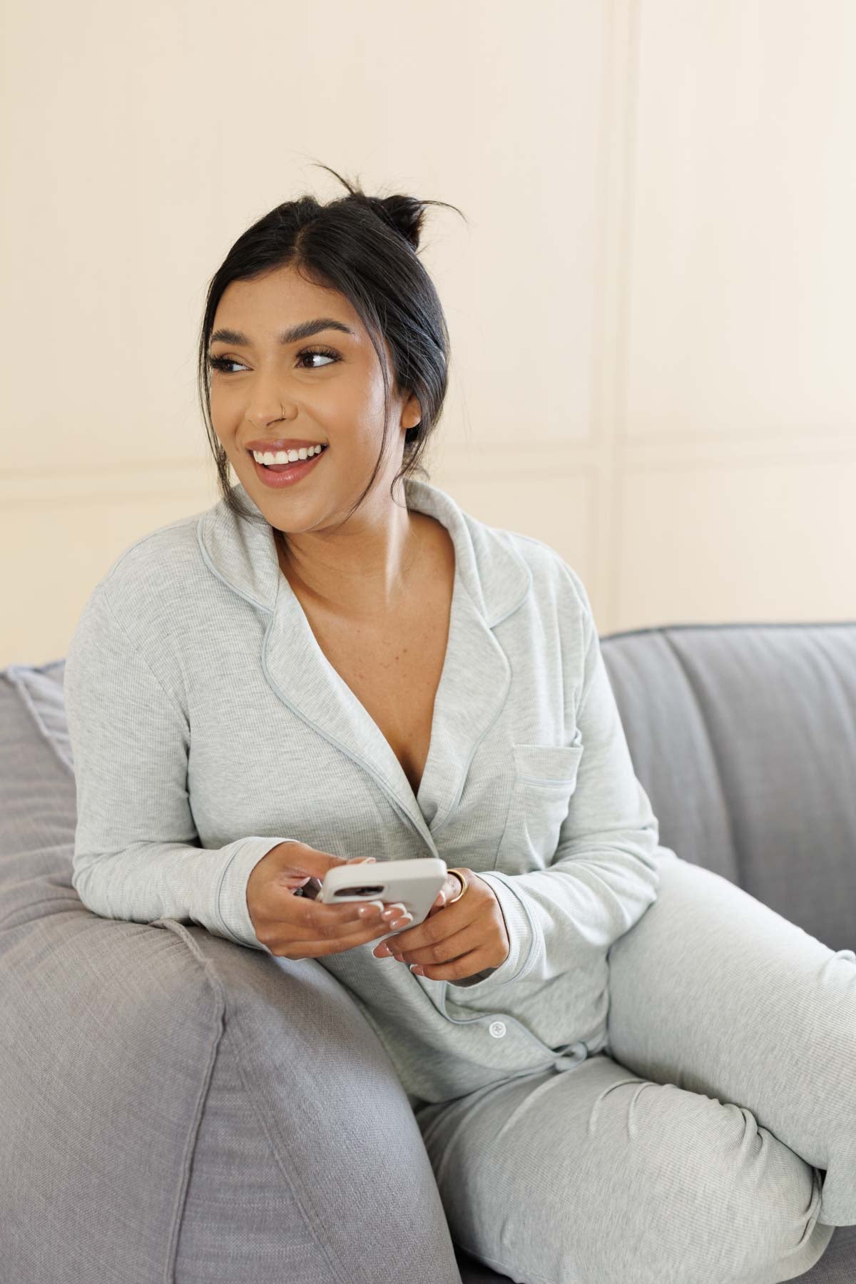- Chic, functional Juliette Ribbed Long Sleeve Pajama Set with easy buttons for early evening dream feed or 2am power pumping session.